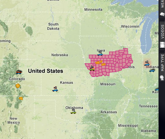 De inwoners van steden als Milwaukee (Wisconsin), Chicago (Ilinois), Kansas City (Missouri) en Wichita (Kansas) zullen de lucht in de gaten moeten houden. Ook de College World Series in Omaha (Nebreska) zullen hoogst waarschijnlijk onderbroken gaan worden door zware onweersbuien.