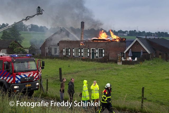 Geldersedijk 85 was natuurlijk ook niet zomaar een Veluwse hoeve. De boerderij is een gemeentelijk monument met een geschiedenis die teruggaat tot het bouwjaar 1861. En altijd bewoond door de (boeren)families Henniphof, van geslacht op geslacht. Ruim anderhalve eeuw bleef de T-boerderij met hallenhuis gespaard voor de gevolgen van het ruwe natuurgeweld. Maar gisterochtend maakte tijdens het korte maar hevige onweer blikseminslag een abrupt en onverbiddelijk einde aan een monumentaal agrarisch bedrijf aan de Geldersedijk. Het echtpaar Henniphof was op dat moment niet thuis. Buren zagen na de mega electrische ontlading al snel de vlammen uit het rieten dak slaan. Zij alarmeerden de hulpdiensten die snel ter plekke waren, maar weinig meer restte dan alles op alles te zetten om de woning naast de boerderij te behouden. Daar woonde de moeder van de boerderijbewoners die op tijd haar woonhuis kon verlaten. In de hoeve zelf waren overigens geen dieren. In de schuur achter de boerderij bevond zich een schaap, maar ook dit dier kon het vege lijf redden. Brandweer-commandant G. ter Heide kon met zijn bluseenheden weinig meer uitrichten. „Er valt weinig eer meer aan te behalen”, verzucht Ter Heide terwijl hij toekijkt hoe de vlammen om zich heen grijpen en zich storten op het interieur. Diverse korpsen hebben het vuur bestreden. De brandweer kon tenslotte weinig anders meer doen dan de boerderij gecontroleerd laten uitbranden. De naastgelegen woning werd wel behouden.