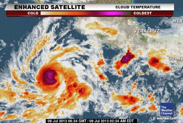 Emilia is sinds de vorige update aanzienlijk in kracht toegenomen. Er is een duidelijk gevormd oog ingebed in het centrum van de circulatie. De wolkentoppen hebben een temperatuur van -70F.