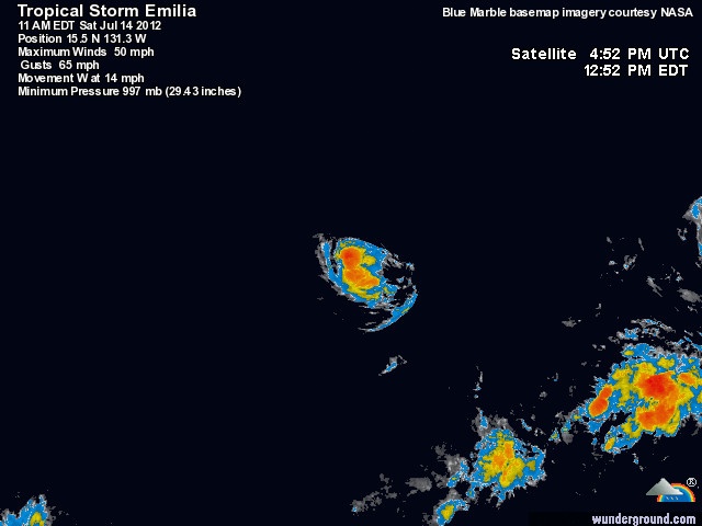 Daniel heeft nog niet de kans gehad om zijn hielen te lichten of Emilia dringt zich naar de voorgrond. Emilia is de vijfde tropische storm van het seizoen in de Stille Oceaan. Voorlopig zal Emilia boven de oceaan blijven.