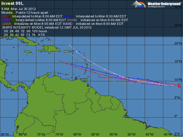 Het zal op de Leeward eilanden zeker nog de hele dag stevig blijven pleznen. De Maagdeneilanden (zoals de USA als de UK) kunnen woensdag de neerslag verwachten. Vervolgens trekt het systeem over HIspaniola, Cuba en de Bahama's. Het zal in de komende drie dagen alles behalve stralend vakantieweer zijn in de gebieden. Komend weekeind bereikt de vochtige lucht Florida.