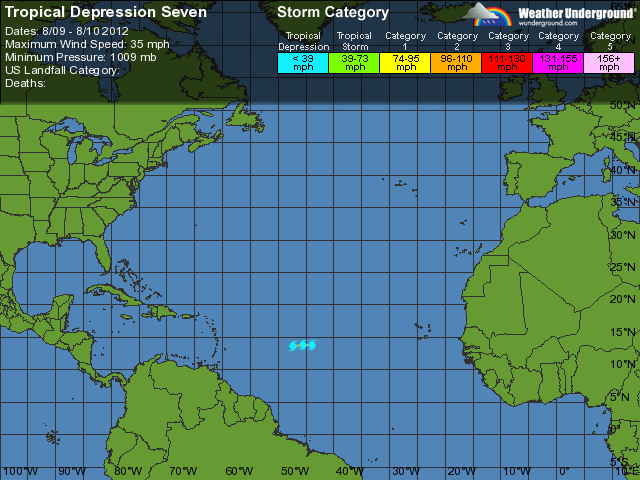 Tropische depressie 7 beweegt zich snel (32 km/h) naar het westen, maar neemt niet in kracht toe. Om 09.00 UTC vond TD7 is op 1495 m ten oosten van de Windward eilanden. De windsnelheden bedragen 55 km/h. De druk ligt op 1009 mb. Later vandaag zal het systeem vermoedeljk uitgroeien tot een tropische storm.
