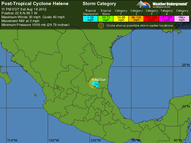 Volgens het U.S. National Hurricane Center had de depressie een said the depression had windsnelheden van 45 kph en lag het systeem op 140 km ten west-noordwesten van Tampico (Mexico). In Tampico is een grote olie raffinaderij gelegen en is een belangrijke haven in de staat Tamaulipas. De stad met ongeveer 790.000 inwoners ligt net boven zeeniveau en is omgeven met meren en lagunues, die snel overstromen. Helen trekt naar het noordwesten met een snelheid van 6 km/h. en zal vandaag vermoedelijk uit elkaar vallen.