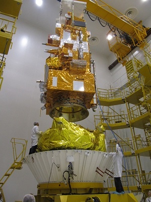 De 4100 kg zware Metop-B wordt bevestigd aan de laatste trap van de Soyouz raket (Bron: Astrium)