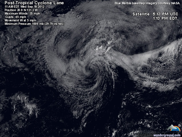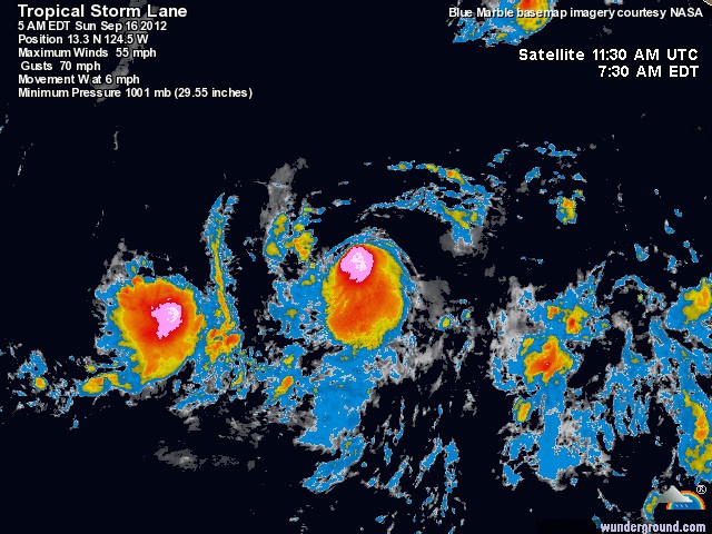 Tropische storm Lane in de oostelijke Stille Oceaan steeds meer kracht. Morgen zal het systeem vermoedelijke uitgroeien tot een rokaan. Het systeem bevindt zich op 1875 km ten west-zuidwesten van de zuidelijke punt van Baja California en vormt geen bedreiging voor landmassa. De windsnelheden bedragen 95 km/h. Het systeem trekt naar het westen met een snelheid van 11 km/h. De druk bedraagt 11 km/h.