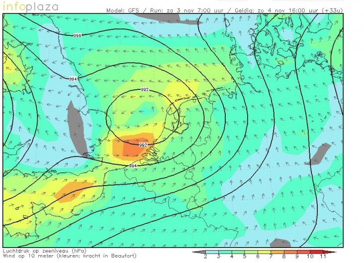 Nou ja op zich zie je op jouw kaartje toch al een stevige wind.. een oranje vlakje is zo ongeveer 80kmp uur = 9 bfrt ! Over het land zie je een behoorlijk groot geel vlak en dat is volgens dat kaartje een dikke 7 en stiekem toch al een 8..