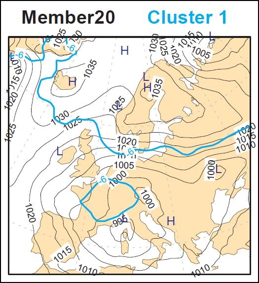 Ik heb er een mooie uitgepakt. Lid 20 ziet het helemaal zitten; een hoog (1035 hPa) boven Scandinavië en een laag (995 hPa) boven Corsica. Een krachtige oostelijke stroming boven onze streken. De winter kan met deze setting beginnen!