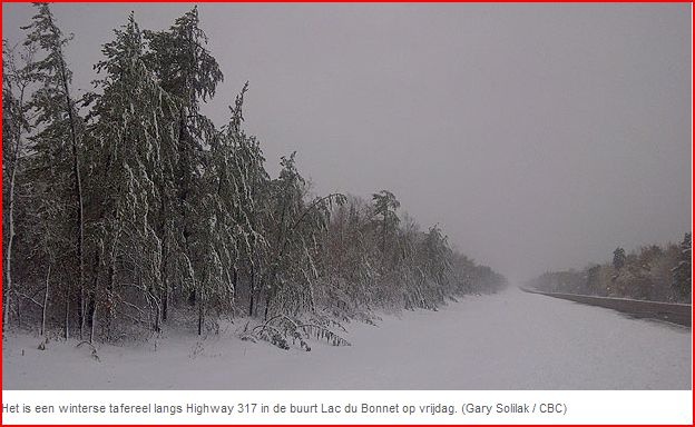Manitoba’s Emergency Measures Organization (EMO) waarschuwt de inwoners van het oosten van Manitoba om maatregelen te nemen in de nasleep van de eerste winterstorm van dit seizoen. Vele steden en dorpen zitten zonder stroom. In sommige gebieden is 15-30cm zware natte sneeuw gevallen. Door de vlagerige wind werd het zicht er slecht en ontstonden er levensgevaarlijke omstandigheden. Op vrijdagochtend trok het gebied van Manitoba naar het noordwesten van Ontario.