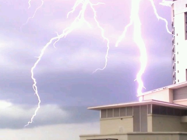 Lightning strike from the storm that hit Brisbane on Saturday morning, captured from the Channel Seven News studio on Mt Coot-tha.