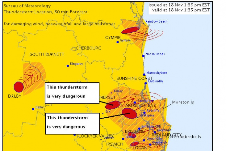 Een enorme onweersbui heeft het zuidoosten van Queensland getroffen. Het BoM heeft diverse weerwaarschuwingen afgegeven. Er zijn binnen een uur in een straal van 80km van Brisbane 4000 ontladingen waargenomen. Volgens een woordvoerder van de politie zijn er 50 mensen geëvacueerd nadat door de storm het dak van een huis in Wilston gedeeltelijk is ingestort. Ook in het Hotel Rendezvous en een ander gebouw op Peel St zijn de daken ingestort. Uit het nieuwe gerechtsgebouw is een groot raam gesneuveld. In Milton, Kangaroo point en de Fortitude Vallei zijn ontelbare bomen omgewaaid. Door het noordweer zijn in de binnenstad van Brisbane diverse straten onder gelopen. In de buitenwijken van Brisbane is de stroom uitgevallen.