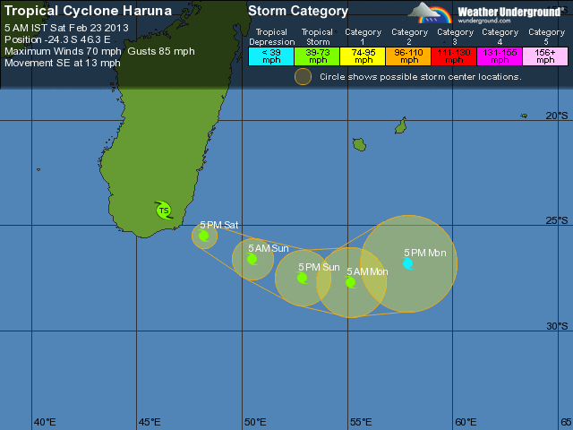 Tropische cycloon Haruna bevindt zich op 285 nautische mijlen ten zuidwesten van Antananarivo (Madagacar). In de afgelopen 6 uur trok het systeem richting het oosten met een snelheid van 6 knopen. Op satellietbeelden is een duidelijk gevormd groot en symmetrisch oog waar te nemen. De cycloon trekt langs de zuidelijke grens van een in het oosten gelegen subtropische hogedrukgebied. Dit hoog is inmiddels afgezwakt door een mid-level trog, welke ten zuiden van de cycloon ligt. De cycloon komt als een categorie 2 cycloon aan land in Madagascar.
