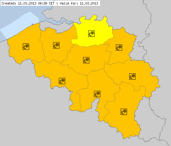 Vanochtend is het glad door ijsplekken.In de loop van de dag gaat het sneeuwen. Er zijn vrij grote verschillen in de berekeningen maar een volgende tendens tekent zich af: hoe meer naar het noordwesten en de Nederlandse grens, hoe kleiner de hoeveelheden. Volgende sneeuwaccumulaties worden verwacht tussen 10u en dinsdag 13u, maar lokale afwijkingen zijn goed mogelijk: