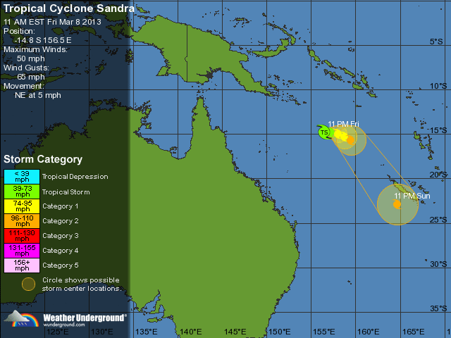 Er wordt in meteorologische kringen al dagen over gespeculeerd en uiteindelijk is het tropische lagedrukgebied in de Coral Sea uitgegroeid tot Sandra, een officiële cycloon. Het categorie 1 systeem bevindt zich op ongeveer 1.000 km ten noord-oosten van Mackay. Sandra trekt richting het noord-oosten met een snelheid van 13 km/h. Er wordt verwacht, dat in de komende 24 uur het systeem zal versterken en naar het zuiden gaat draaien. Sandra zal tot zeker het midden van volgende week buitengaats blijven.