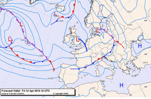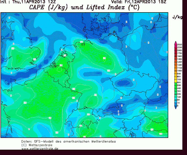 Eindelijk is het dan zo ver, de eerste redelijke onweerskans van 2013 staat voor de deur. In het algemene topic zijn de laatste dagen al vele kaartjes gepost van de kans op onweer voor morgen. Morgen rond de middag trekt een trog van zuid-west naar het noord-oosten over Nederland en België. Rond de trog neemt de onstabiliteit snel toe en kunnen lokaal pittige buien gaan ontstaan met kans op onweer, ook kunnen tijdens buien flinke windstoten voorkomen tot 75 km/h. De waardes voor morgen zijn niet extreem hoog, cape zit zo rond de 500 en de Lifted tot -2. Er zit kwa tijd wel wat verschil in de modellen, GFS heeft kans op onweer tussen 12:00 en 18:00 en MeteoVista-MOS vanaf 15:00 tot 0:00. Hopen dat de laatste gelijk heeft kunnen we nog wat onweer zien als het donker is.