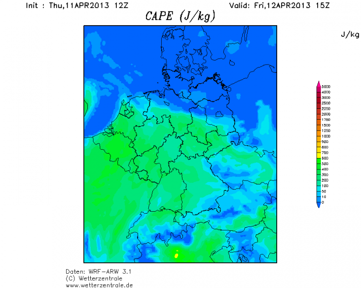 Ik verwacht dus geen grootschalig noodweer, maar gewoon wat maartse buien (zie volgende alinea) met hagelsteentjes tot 1 cm en wolkentoppen van 7-9 km. De CIN (hoeveelheid energie die het opstijgen van lucht tegenhoudt als een soort deksel) is minder dan 0-10 J/kg dus de buienvorming wordt nauwelijks tegengehouden. De trog zal de buienvorming wat bevorderen denk ik. Ook laten GFS, EC en WRF een buiig neerslagsignaal zijn. Ik denk dat er overal in de Benelux wel kans op is (zolang er CAPE is), maar vooral in het zuiden.