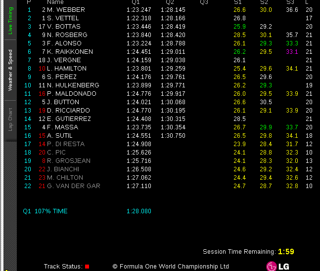 In de eerste sessie ging iedereen meteen naar buiten op de superzachte band. Het bleek echter te nat en de teams moesten meteen weer pitten voor intermediates. Gedurende de sessie droogde de baan lichtjes aan op en werden de tijden sneller. Grootste slachtoffers waren Romain Grosjean en Paul Di Resta. Beide rijders kregen de banden niet snel genoeg opgewarmd en extra regen liet hen niet toe om hun tijd nog te verbeteren. Giedo van der Garde kon geen vuist maken en bleef steken op de laatste plaats. Charles Pic kon zich voor Romain Grosjean kwalificeren. Die laatste zal morgen sowieso vanaf de laatste plaats starten dankzij zijn gridpenalty die hij opliep na zijn crash met Ricciardo in Monaco.