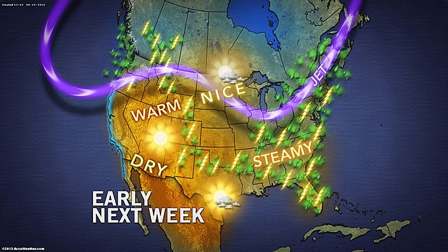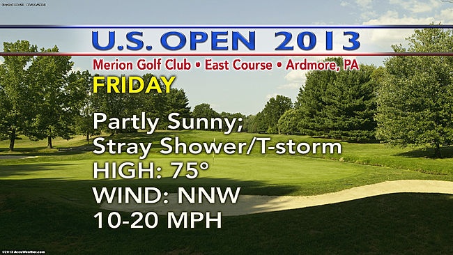 Er bestaat geen dreiging meer voor noodweer in Ardmore (Pa) waar de US Open golf wordt gehouden. Maar dit weekeind worden wel buien en mogelijk onweer verwacht. Ondanks de relatief lage temperaturen wordt het in het weekeind warm genoeg om lokale buien te laten ontstaan. De koele en winderinge omstandigheden worden veroorzaakt door een nor'easter. Zaterdag wordt een bijna perfecte dag om te golfen. Zondag is de kans op een regen- of onweersbui weer aanwezig. Een systeem rolt het Midwesten binnen over de Appalachen. Het zal overwegend droog blijven.