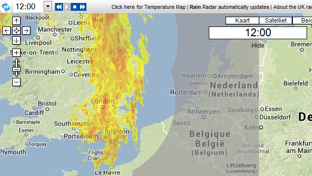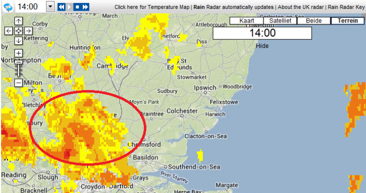 Vandaag trekt in de loop van de middag een warmtefront over Engeland en dat gaat er af en toe wat regen kan gaan vallen. Veel ruimte voor de zon is er niet vandaag, momenteel ligt bijna heel Engeland, inclusief Londen al onder de bewolking behorende bij het front. Morgen is het opnieuw wisselvallig weer, met van tijd tot tijd regen. Daarna lijkt het droog te blijven, en is er meer ruimte voor de zon.
