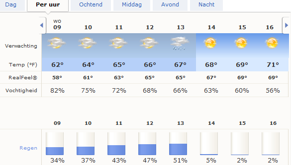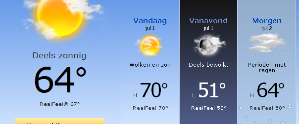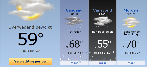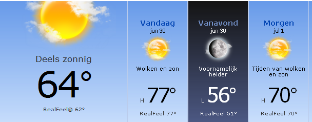 Vandaag is er aan het begin van de middag kans op een enkele bui, later in de middag en begin van de avond verloopt het meest droog en is er geregeld zon. Morgen blijft het de hele dag droog en wisselen wolken en zon elkaar af. De temperatuur schommeld zo rond de 22 á 23 graden.
