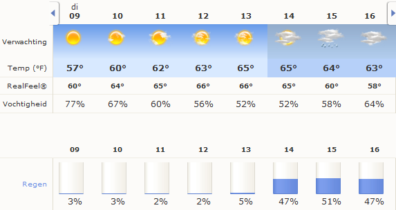 Vandaag verloopt overwegend bewolkt en kan er later vanmiddag van tijd tot tijd wat lichte regen vallen. Grote hoeveelheden worden niet verwacht. Morgen verloopt vrijwel het zelfde als vandaag, echter de kans op neerslag en hoeveelheden is groter dan vandaag. Van het weekend wordt er weer beter weer verwacht.