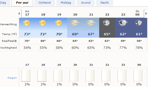 Vandaag is het grotendeels zonnig, met in de ochtend en begin van de middag nog wat hoge sluierbewolking, maar deze lost gedurende de middag steeds verder op. De temperatuur komt uit op 25 tot 26 graden. De komende dagen verlopen droog. Woensdag kan wel eens een regendag gaan worden. De overige dagen tot de finale lijken droog te gaan verlopen.