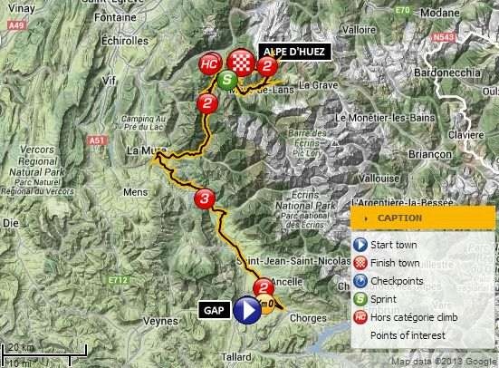 De route van Embrun naar Chorges is 32 kilometer lang, ongeveer dezelfde lengte als de eerdere tijdrit dus, alleen is deze licht geaccidenteerd. De Hautes-Alpes rondom zijn ontegenzeggelijk van ansichtkaartallure. Lac de Serre-Ponçon wordt gevuld met water van de rivieren Durance en Ubaye. De tijdrit gaat van start in Embrun, aan de oostkant van Lac de Serre-Ponçon. De renners moeten gelijk op de pedalen bij de bestijging van Côte de Puy-Sanières, een klim van 6,4 kilometer lang met een gemiddeld stijgingspercentage van 6%. Bovenop ligt het eerste meetpunt. Na de afdaling volgt de 6,9 kilometer lange klim naar de Côte de Réallon (gem. stijgingspercentage: 6,3%). daar ligt meetpunt twee, de renners hebben dan 20 kilometer achter de rug. Het parcours blijft nog even licht omhoog gaan, maar dan volgt de afdaling van zo'n 10 kilometer naar de finish in Chorges. Jammer dat meester-daler Vincenzo Nibali er deze Tour niet bij is...