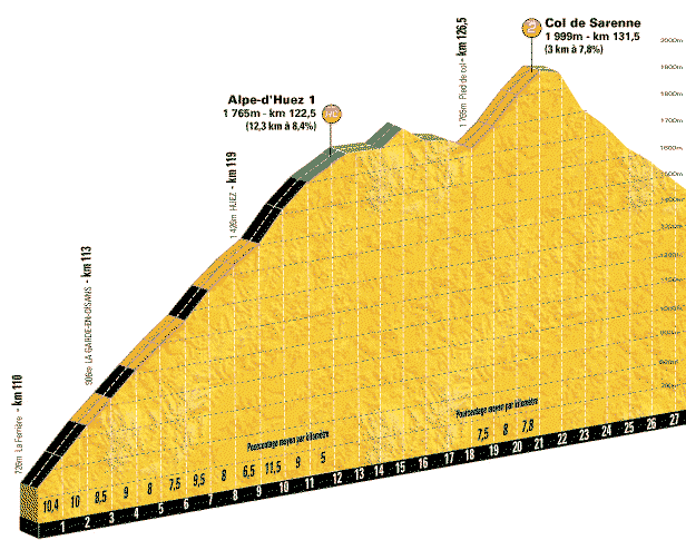 Via Bourg d’Oisans draait de wielerkaravaan de ‘Hollandse berg’ op. De klim naar Alpe d’Huez telt 21 haarspeldbochten, allemaal vernoemd naar renners die op de top ooit zegevierend over de streep gingen. De renners slingeren zich een weg omhoog. Ze moeten ruim 12 kilometer klimmen, en daarbij is het gemiddelde stijgingspercentage 8,4 procent. In plaats van naar de top te klimmen, rijden de renners het dorpje door. Op naar de Col de Sarenne! Wat volgt is een klim door een kaal, verlaten landschap. Lang duurt deze opgave niet, na drie kilometer stoempen bereiken de renners de top. Een lange afdaling volgt.