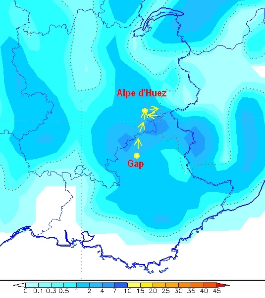 Het gaat slecht weer worden in de Tour de France, mogelijk zeer slecht weer. Bewolking, talrijke buien, windvlagen en kans op onweer zorgen voor zware omstandigheden. Met name op Alpe d'Huez, waar honderdduizenden mensen worden verwacht, kan het donderdag af en toe fors regenen. Zojuist meldt NUsport het volgende: "Het parcours van de rit van donderdag wordt volgens de Franse televisie mogelijk aangepast, uit veiligheidsoverwegingen. Wellicht wordt de afdaling van de Col de Sarenne geschrapt en wordt er maar één keer geklommen op Alpe d’Huez."