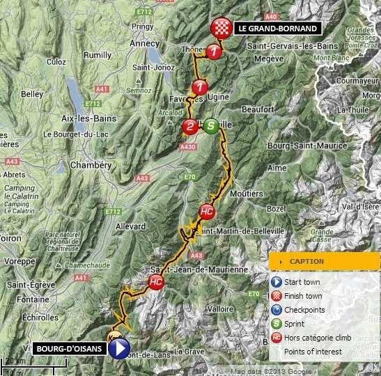 Pièce de résistance van deze 20e etappe van de Tour de France van 2013 is de beklimming naar skioord Semnoz. Die is 10,7 kilometer lang en stijgt gemiddeld met 8,5%. Tussen 2 en 3 kilometer zit het steilste stuk (10,5%). Dan vlakt de klim af, om tussen 5 en 7 kilometer weer met een stijging van 9,5% om flinke krachtinspanningen te vragen. Mocht er nog niemand in de aanval zijn, is dit een mooi punt voor de mannen die nog wat willen, én kunnen. Tussen 8 en 9 kilometer gaat het dan nogmaals met 9,5% omhoog. De finish is getrokken op 1.655 meter boven zeeniveau.