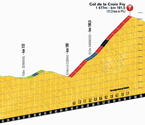 Na de vrijage met deze ijskoningin volgt een lange afdaling. Vanaf kilometerpaal 130 krijgen de coureurs de Col de Tamié (8,6 kilometer, 6,2%) en de Col de l'Épine (6,1 kilometer, 7,6%) voor de wielen, waarna ze aan de laatste klim beginnen: de Col de Croix Fry. Om daar, op 1.477 meter hoogte, te komen moeten ze een 11,3 kilometer lange klim van een gemiddelde stijging van 7% verteren. Op zich goed te doen, maar met de Glandon en de Madeleine in de kuiten sta je er toch wat minder onbevangen tegenover. Na een halve kilometer dalen, finisht het peloton in Le Grand Bornand. Het wordt geen vroegertje.