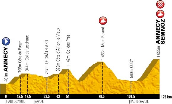 Nu slingert deze etappe zich de bergen rond het meer in, dat overigens 18.000 jaar geleden ontstond na de laatste ijstijd. De renners zullen het steeds kleiner zien worden en al na 12,5 kilometer fietsen arriveren ze bovenop de eerste col: Côte de Puget, op 796 meter, een klim van de 2e categorie. Na de beklimmingen van Col de Leschaux (3e categorie), Côte de Aillons-le-Vieux (3e categorie) en Col des Prés (3e categorie) volgt een afdaling die de renners weer tot meerniveau brengt. Nogmaals buigt het asfalt omhoog. De beklimming van Col du Mont-Revard (1.463 meter) is met een gemiddeld stijgingspercentage van 5,6% geen lastige, maar door de lengte van 15,9 kilometer zal het hier wellicht toch al duidelijk worden wie er straks in de grote finale van deze Tour nog brokken kan maken. Hoewel. Het is niet ondenkbaar dat er op de allereerste klim al iemand vandoor is gegaan. Het zou mooi zijn. Een beetje in de geest van Contador die in 2011, in de korte etappe over de Télégraphe en Galibier en met de finish op de Alpe d'Huez, al direct de aanval koos zodra het bergop ging.