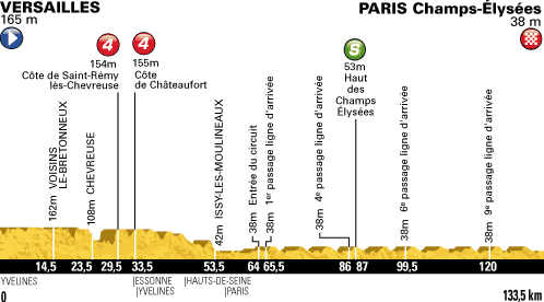 De etappe begint in Versailles en daarvandaan wordt niet de snelste route naar de Champs-Elysées genomen, anders zouden de renners in 20 kilometer klaar zijn. Sterker, ze zouden het kunnen lopen, zoals de poissardes dat op 5 oktober 1789 tijdens de Franse revolutie deden. Wat begon als een demonstratie tegen de hoge broodprijzen eindigde in een woedende strooptocht van duizenden. De massa belegerde het Paleis van Versailles, waar de Franse koningen sinds Lodewijk XIV woonden. De mars had zes uur geduurd. Zolang zullen de renners er niet over doen en het is te verwachten dat etappe 21 in een gemoedelijker sfeer zal worden verreden. Lachende renners voor de fotografen, champagne nippen, en zodra de Eiffeltoren in zicht komt gaat het gas erop. Champs-Elysées, Place de la Concorde, langs de tuinen van het Louvre, tunneltje door, langs de kermis aan de Rue de Rivoli en weer terug de Champs-Elysées op – de meeste renners kunnen het traject dromen.