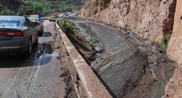 Mud, rocks and water covered Highway 24 west of Manitou Springs Wednesday, June 10. Photo by John Schroyer. The Gazette