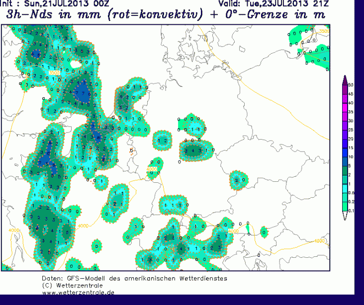 Na een hete en zonnige start van de week is er een onderbreking van de droogte in zicht. Het wordt steeds aannemelijker, dat op woensdag een onweersgebied vanuit Frankrijk Duitsland intrekt. Dit front brengt zware stortregens, hagel en zware windstoten met zich mee. Het is nog steeds erg onzeker hoe ver noordwaarts de lijn met onweersbuien gaat trekken. Onder de huidige omstandigheden blijft het van de Ostsee tot aan de Oder overwegend droog.
