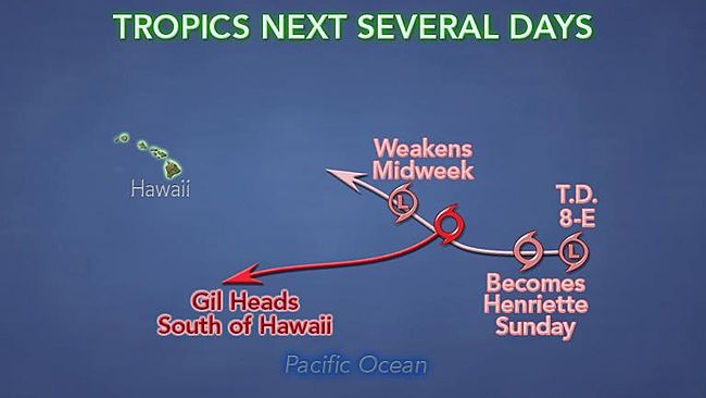 Om 1500 UTC lag het centrum van tropische storm Henriette op 2075 km tn west-zuidwesten van de zuidelijke tip van Baja California. De gemiddelde windsnelheid bedraagt 65 km/h. Het systeem trekt naar het westen met een snelheid van 15 km/h. De druk bedraagt 1005 mb. Maandag zal het systeem een draai naar het west-noordwesten maken. Henriette wordt in de komende dagen sterker. Het systeem vormt geen gevaar voor het vasteland