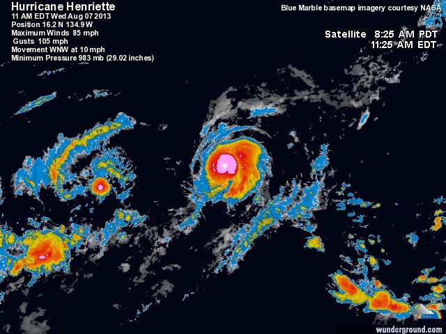 De voormalige orkaan Henriette is zondag afgezwakt tot een tropische depressie en is op 12 augustus van de kaart verdwenen. Op onderstaand 3D radarbeeld van de TRIMM satelliet is het verschil in de verschillende fases goed te zien. Op het linkerbeeld zijn tophoogtes te zien van meer dan 16 km. Dit staat in contrast met de minder dan 12km hoge wolken op het rechterbeeld.