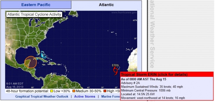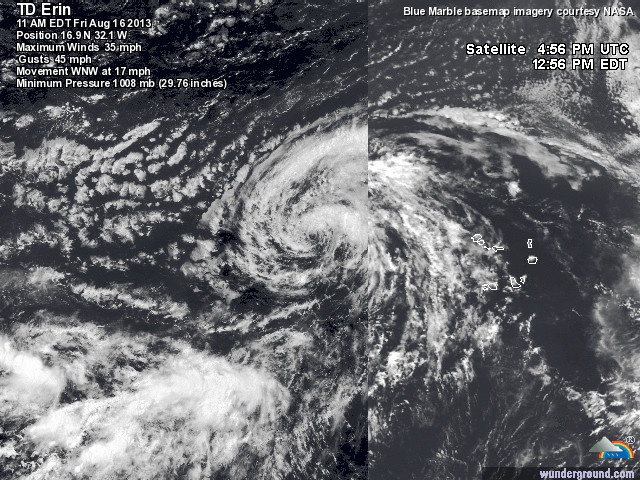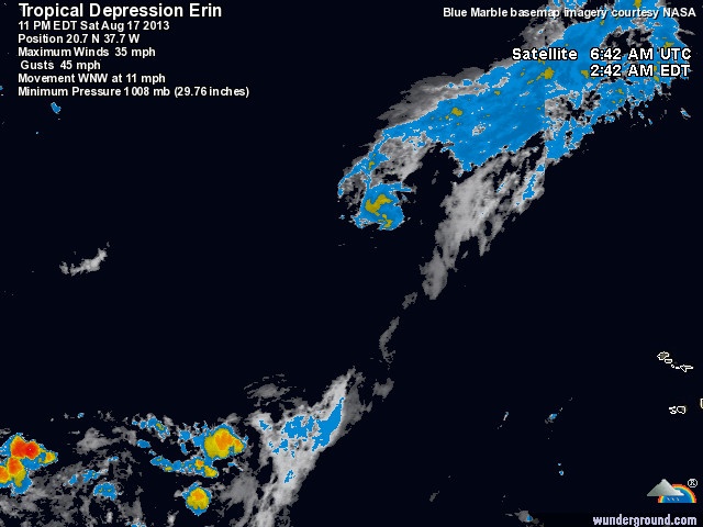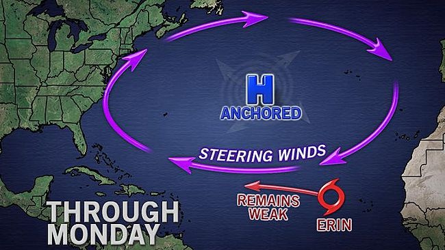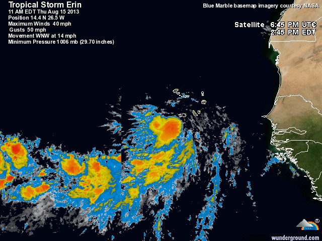 Erin is wederom uitgegroeid tot een tropische storm. Het systeem was even afgezwakt tot een tropische storm. Erin blijft richting het west-noordwesten trekken over open water. Dit weekeind krijgt Erin te maken met andere omstandigheden. Momenteel trekt Erin door een gebied met warm water en komt in een minder vochtig maar stabielere lucht terecht.