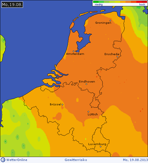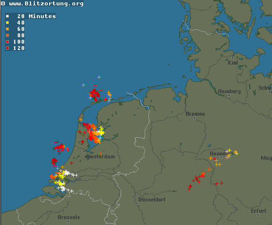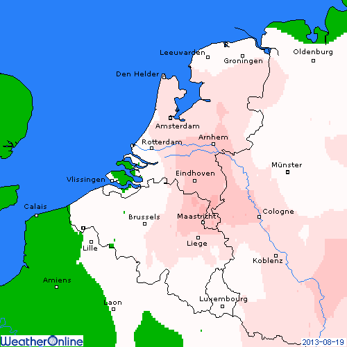 Momenteel zijn de eerste buien op de Noordzee ontstaan op de grondtrog en er zit lokaal al onweer op. Deze buien lopen aan het begin van de ochtend het land op. het land op. HiRLAM en EC laten dit proces mooi zien. In de loop van de dag krijgen de buien boven land nog een extra impuls door de dagelijkse gang. Hirlam komt tot en met vanavond lokaal met 20 mm, vooral in het oosten van het land. De kans op onweer is zeker aanwezig, zie ook actuele buien boven de Noordzee, vanmiddag is de kans op onweer landinwaarts nog groter. Het verschil tussen grondtemperatuur en T500 is dan ongeveer 40 graden. KOUW geeft kansen van tot ruim 90% in het oosten en zuidoosten van het land. Ook de kans op hagel is niet helemaal uit te sluiten.