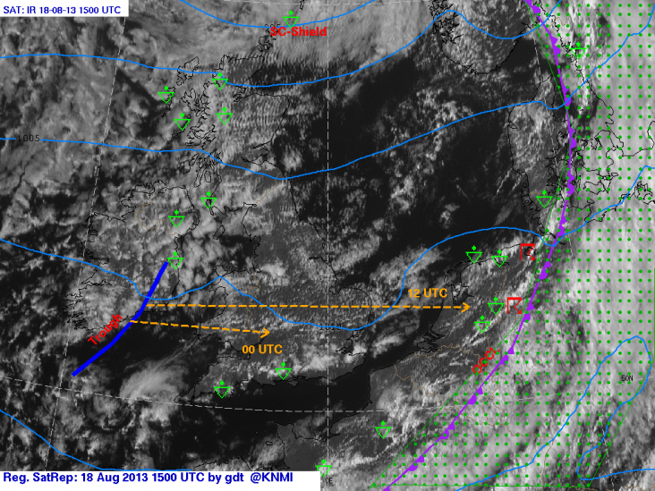 Achter de occlusie Cu-bewolking, een enkele TCU met toppen tot rond FL100. Progtemps bevestigen dit. In het oosten enkele CB. Vannacht hogere bewolking, zuidoosten frontale bewolking, kansen op CB dan klein. Maandag in de ochtend mogelijk wat turbulentiestratus, progtemps geven hiervoor wel een aanwijzing. Maandagochtend vroeg al de eerste CB in het westen van het land. Alle modellen bevestigen dit. Later maandag stabiliserende atmosfeer.