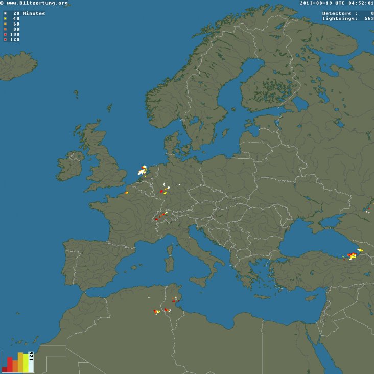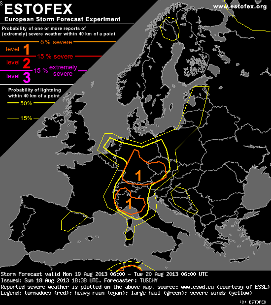 During the afternoon hours, the southbound moving cold front arrives in NW Italy and taps into increasing BL moisture with 0-1 km average mixing ratios in excess of 13 g/kg. This amount of BL moisture offsets the weak mid-level lapse rates and results in robust at or above 1000 J/kg MLCAPE. 20 m/s DLS overspread the surface front and assist in well organized multicells and isolated supercells with large hail and a strong to severe wind gust event. Even an isolated tornado event can't be ruled out with 100-200 J/kg 0-3 km CAPE forecast by local WRF. This activity grows upscale into a large cluster of thunderstorms during the night while moving to the south and east. The hail and wind risk continues, although heavy rain becomes the predominant risk betimes. | Gewijzigd: 18 augustus 2013, 21:00 uur, door Stormpie