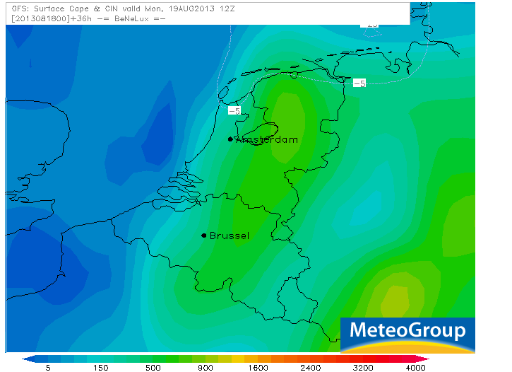 Morgen overdag a.g.v. van de dynamische forcering bij de hoogtetrog i.c.m. de koude bovenlucht veel convectieve bewolking met ook vorming van Cb's, progtemps laten toppen toe tot FL300. In de tweede helft van de middag neemt stabiliseert de atmosfeer a.g.v. hogedrukopbouw.