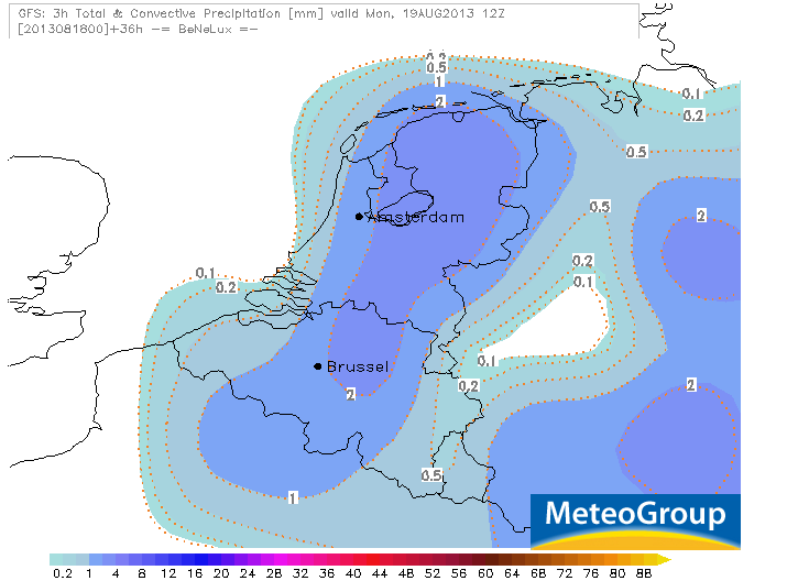 Maandagochtend schuiven de buien behorende bij die extra stijgbewegingen, van west naar oost over het land. In de late nacht trekken de buien de Noordzeekusten in het westen binnen en daarna vervolgen ze hun weg richting Duitsland. In eerste instantie werkt het tijdstip enigszins tegen. Immers, het land is tegen het ochtendgloren op z’n koudst en kan van onderaf dus weinig extra warmte toevoegen om de buien wat meer power te geven. Er zullen dan ook maar een paar buien over de westelijke provincies schuiven.