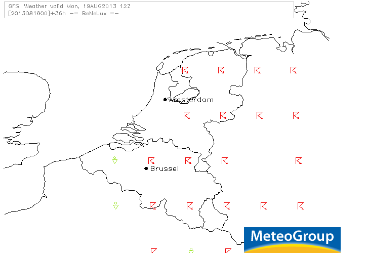 Voor wat betreft rukwinden lijkt er niet veel aan de hand. Daarvoor zijn de temperatuurverschillen tussen vóór en ná de bui te klein. Ook de wind op 3 a 4 kilometer hoogte (belangrijke hoogte voor de indicatie van windstoten) is niet stevig te noemen. Tijdens de late ochtend en vroege middag is de wind op 9 a 10 kilometer hoogte wel fors, daarna komen we pal onder de ‘put’ terecht en valt de wind weg. Niet alleen op vlieghoogte wordt het dan ineens vrijwel windstil, aan de grond waait er sowieso maar een licht briesje. Dat is gelijk ook het lastige voor morgen; daar waar een bui eenmaal tot stand komt, zal ‘ie helemaal uit kunnen regenen. Immers, de wind drijft de bui nergens naar toe.