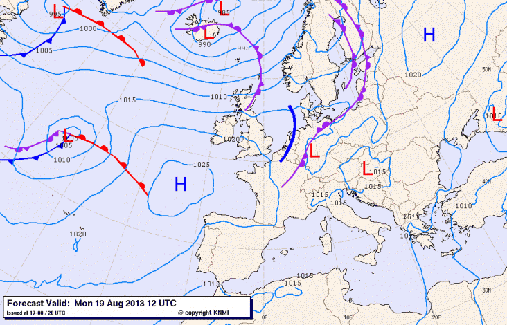 De weerkaart voor maandag 19 augustus. Een hogedrukgebied is in zicht, maar eerst passeert nog even een venijnige storing.