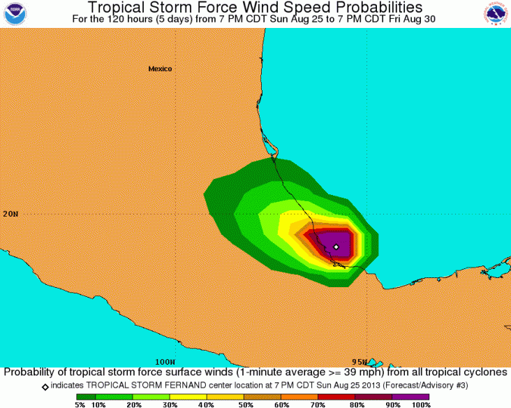 Om 0600 UTC lag het centrum van tropische storm Fernand op 55 km te noord-noordwesten van Veracruz (Mexico). Het systeem trek t naar het west-noordwesten met een snelheid van 15 km/h. De gemiddelde windsnelheid bedraagt 85 km/h met zwaardere windstoten. Terwijl het systeem over land trekt zal deze vandaag in kracht gaan afnemen. De wind met tropische storm kracht reikt tot 55 km vanuit het centrum. Fernand zal zo'n 10-20cm neerslag produceren.