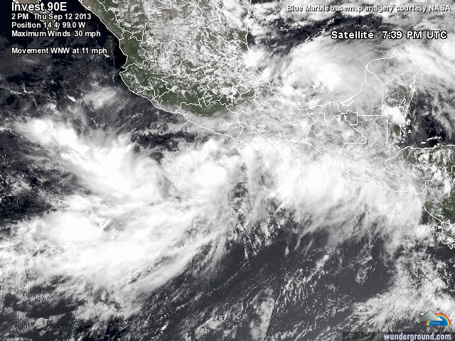 Een groot lagedrukgebied ten zuid-zuidoosten van Acapulco (Mexico) produceert een groot gebied van ongeorganiseerde regen- en onweersbuien. Krachtige upperlevel wind en de nabijheid van het land zorgen ervoor, dat dit systeem zich niet snel kan ontwikkelen, als het zich al ontwikkelt. Ongeacht deze ontwikkeling veroorzaakt het gebied in combinatie met de storing in de Baai van Campeche (93L) voor zware tot zeer zware regenval in delen van het zuiden en oosten van Mexico. Hierdoor kunnen door overstromingen en modderstromen levensgevaarlijke situaties ontstaan.