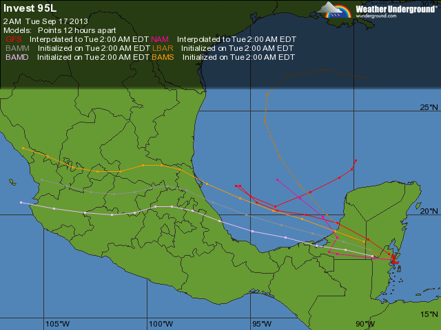 Een lagedrukgebied nabij de kust van Beliza produceert een groot gebied van ongeorganiseerde regen- en onweersbuien boven het noordwestelijke deel van de Caraïbische zee. De storing trekt naar het west-noordwesten over Belize en het Yucatan schiereiland en komt uiteindelijk in de Baai van Campeche erecht. De windshear wordt in de komende dagen gunstiger voor verdere verdieping van het systeem. Het gebied zal bijna stationair gaan draaien boven de zuidwestelijke Golf van Mexico.