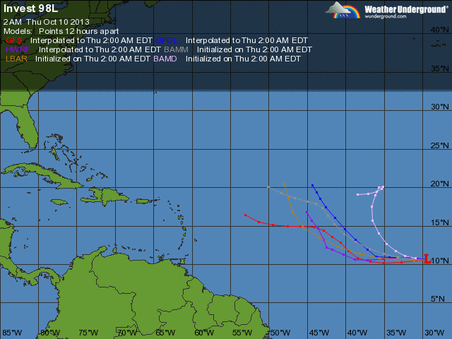 Een trog van lagedruk bevindt zich op meerdere honderden kilometers ten oosten van de benedenwindse eilanden. Het gebied blijft regen- en onweersbuien produceren. Door de krachtige upper-level wind blijft de deksel op de pan en wordt iedere significante ontwikkeling de kop in gedrukt. Het systeem trekt naar het west-noordwesten. De kans is klein, dat dit systeem zich in de komende 48 uur ontwikkelt tot een tropische depressie