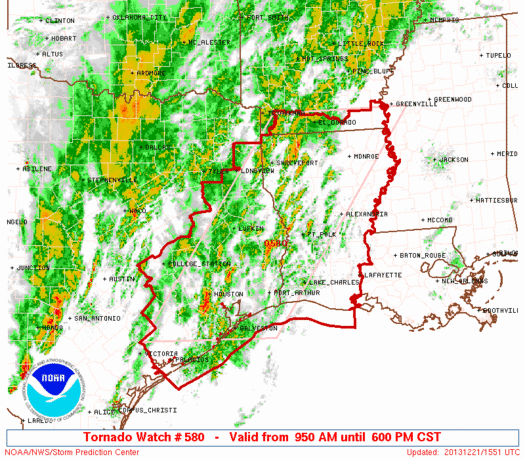 Het SPC houdt rekening met mogelijk extreem weer. Het aankomend weekeind wordt dit verwacht in delen van het oosten van Texas tot de Mississippi vallei. Er bestaat een risico op mogelijk destructieve wind en tornado's.
