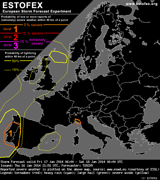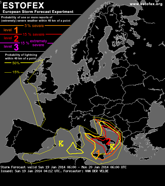Storm Forecast: A level 2 was issued for southern Italy and west Balkan coast mainly for a combined threat of excessive convective rainfall, tornadoes, severe wind gusts and large hail. A level 1 was issued for surrounding areas for similar phenomena.